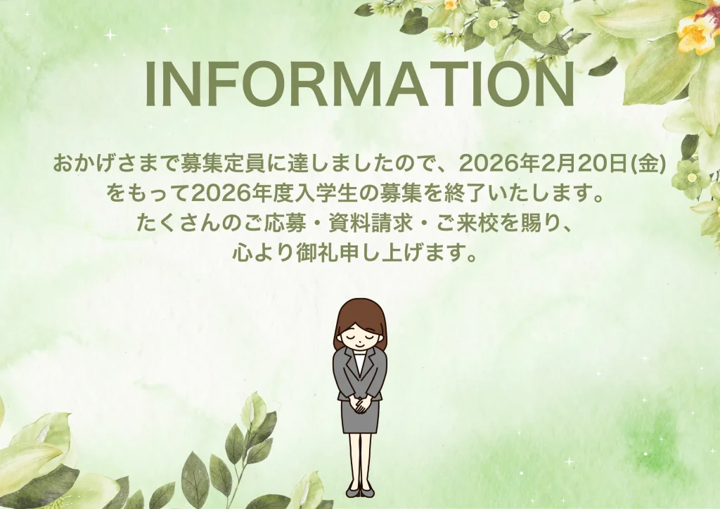 2026年度入学生募集終了のお知らせおかげさまで募集定員に達しましたので、2026年2月20日(金)をもって2026年度入学生の募集を終了いたします。 たくさんのご応募・資料請求・ご来校を賜り、心より御礼申し上げます。